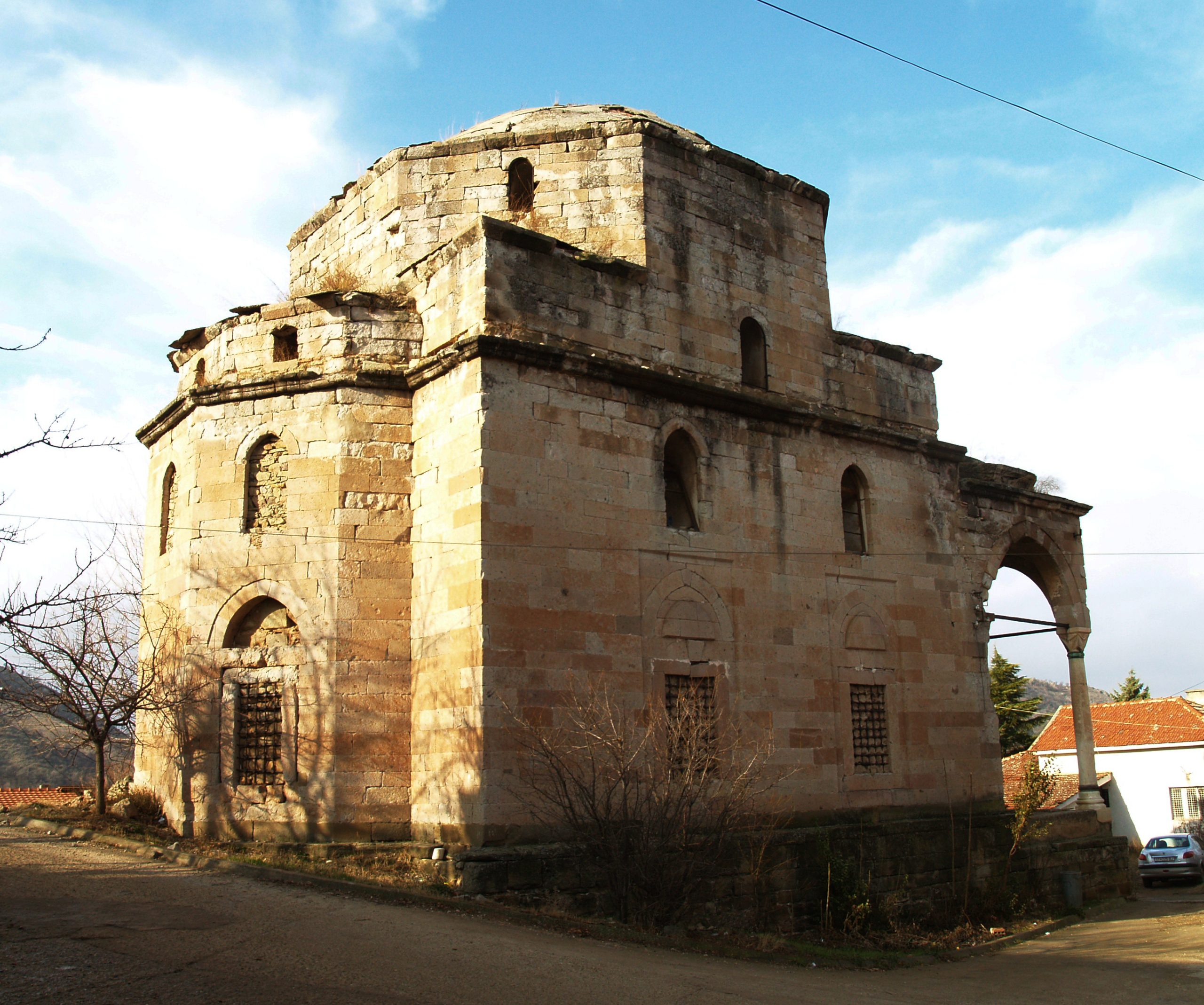 In its overall form, the mosque is a single-dome building with a square ground plan, with clean proportions of 9.1 m, covered by a dome and with an added open porch on four columns, topped by three small low domes.